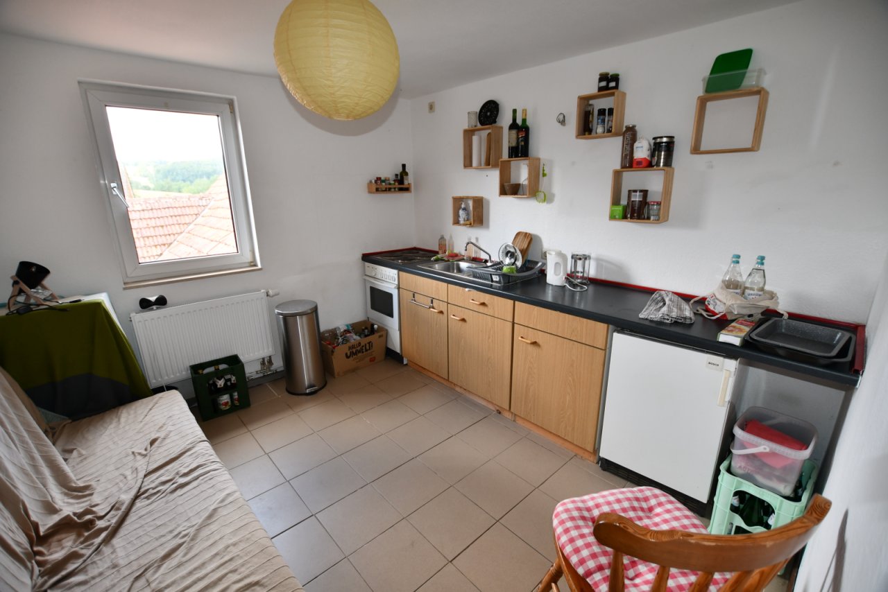 Die Einliegerwohnung befindet sich im Obergeschoss des Wohnhauses und hat einen extra Eingang. Hier gibt es ein Badezimmer mit Dusche, eine Küche und einen offenen Wohn- und Schlafbereich.