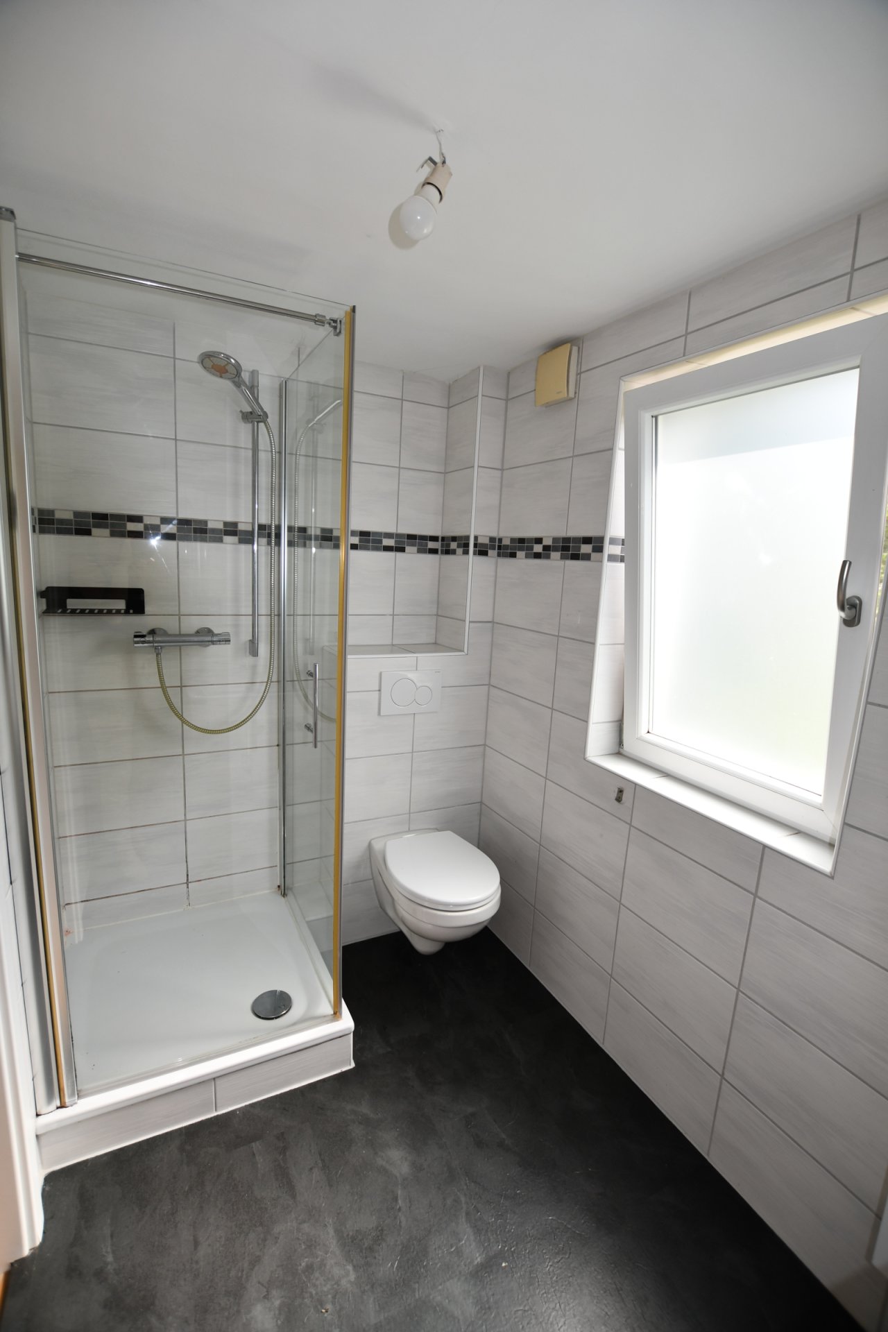 Im Obergeschoss steht ein Zimmer zur Verfügung, durch das man in ein weiteres Badezimmer mit Dusche und Fenster gelangt.