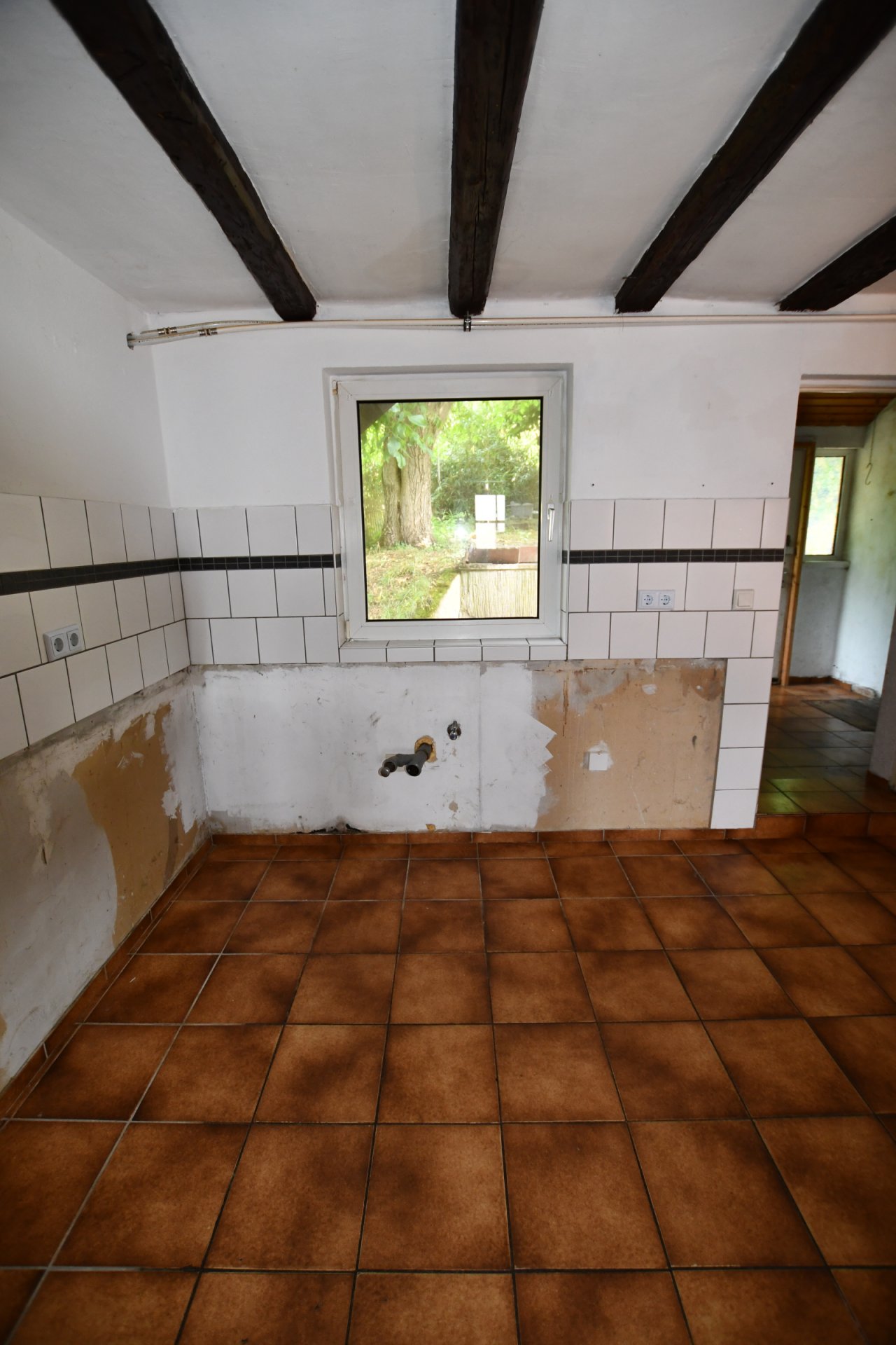 Im Erdgeschoss befindet sich ein offener Wohn- und Essbereich mit Kachelofen, der für zusätzliche Wärme und eine gemütliche Atmosphäre sorgt, eine Küche, ein großes Zimmer sowie ein Badezimmer mit Dusche und Fenster. Von der Küche aus gelangt man in das angebaute Backhaus. Das Backhaus hat einen Ausgang in den Garten.